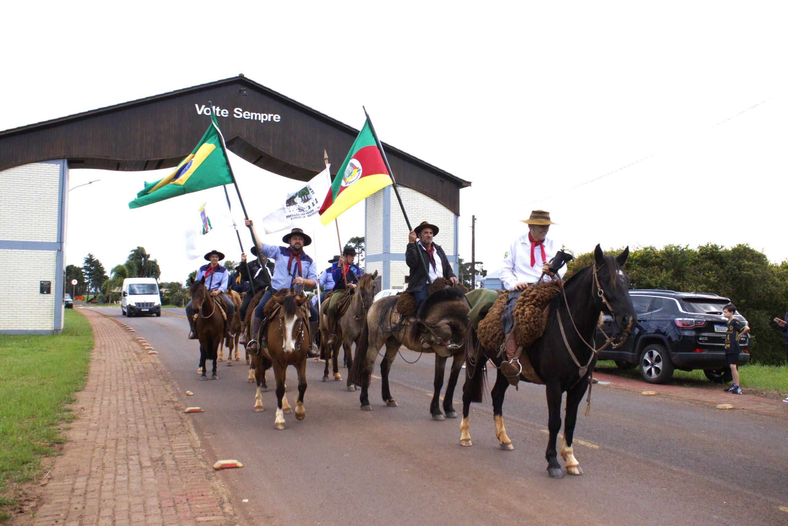 Na manhã desta segunda-feira (01), cavaleiros que vieram da Sede Aurora carregando a chama crioula, foram recepcionados pelas autoridades no pórtico de Fortaleza dos Valos, e seguiram em cavalgada até o CTG Estância do Umbu.